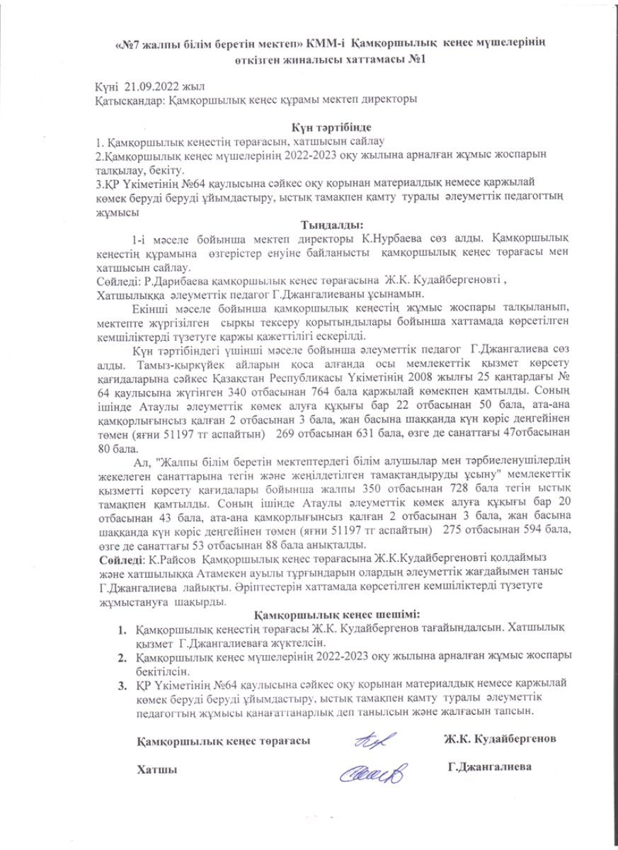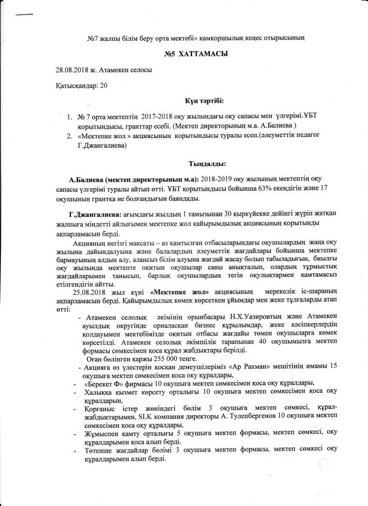 №7 орта мектептің ОІЖОК.Т.Кобланова «Мектепке жол» акциясының іс-шаралар жоспарын жасап, жасалған жоспар бойынша мектеп мұғалімдері әлеуметтік көмекке мұқтаж балалардың дерек қорын қалыптастыру, мектепке бармай жүрген балаларды анықтау, үйлерді (пәтерлерді) 36 мұғалім 908 үй аралап тексеру жұмыстарын жүргізді. Әлеуметтік педагогы тарапынан Мұнайлы ауданы, Атамекен ауылдық округ әкімінің міндетін атқарушы Н.Уазировке және Атамекен селосында орналасқан барлық ұйымдарға, бизнес-құрылымдарға, үкіметтік емес ұйымдарға әлеуметтік қолдау қажет ететін оқушыларға, көмек көрсету мақсатында аталған акцияға қатысу үшін хаттар жолданды.