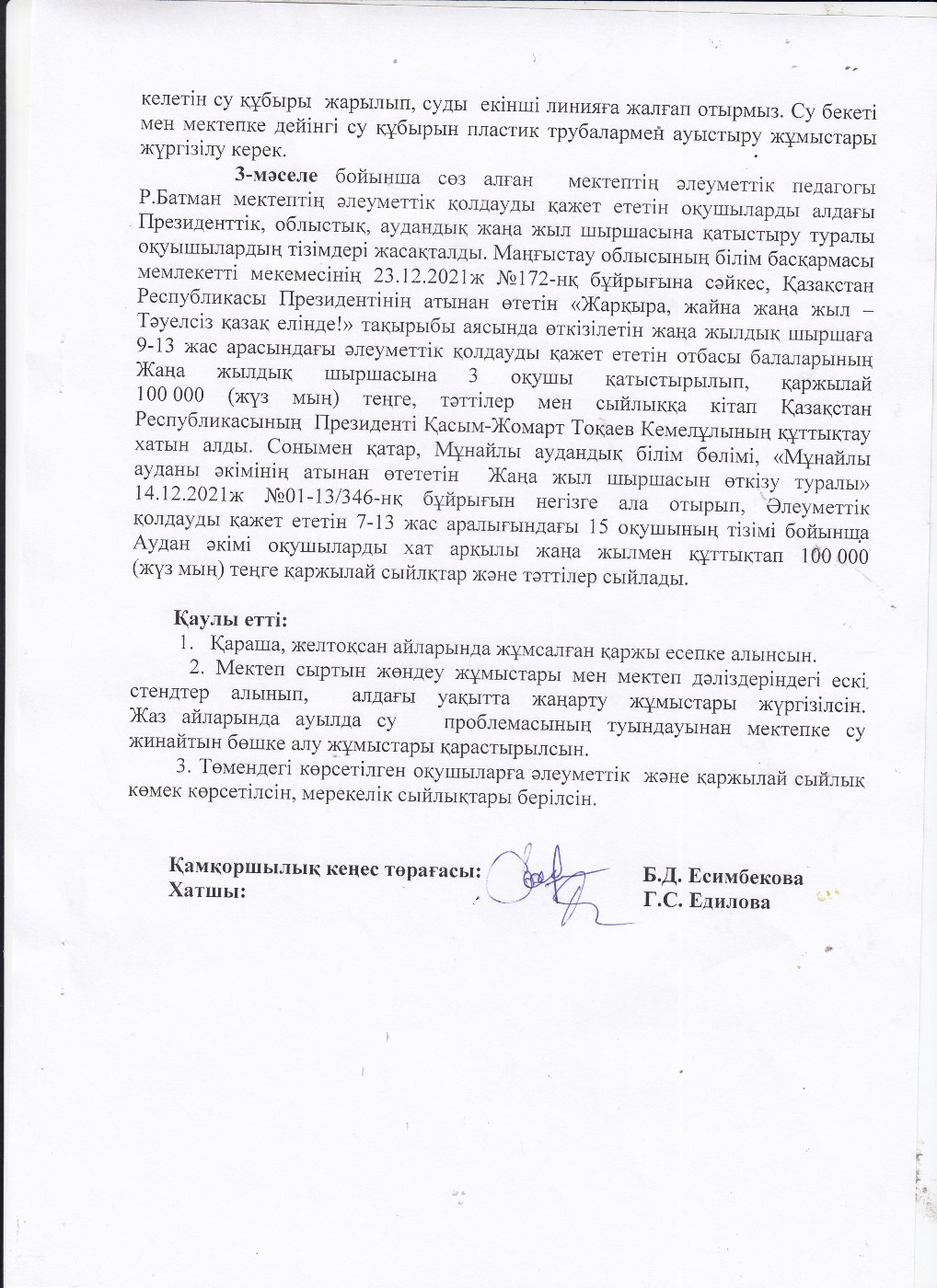 Әлеуметтік көмекті қажет ететін оқушылардың тізімі анықталып, жергілікті мемлекеттік мекемелерге бекітілді. Нәтижесінде Атамекен ауылдық әкімшілік тарапынан және жеке кәсіпкерлер тарапынан 211 оқушыға көмек көрсетілді. Көрсетілген көмектің түрі: Мектеп формалары, мектеп сөмкесі оқу құрал-жабдықтарымен.