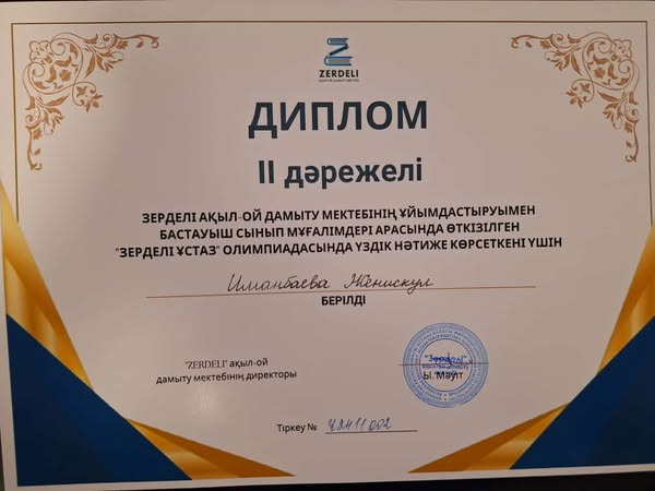 ЗЕРДЕЛІ АҚЫЛ-ОЙ ДАМЫТУ МЕКТЕБІНІҢ ҰЙЫМДАСТЫРУЫМЕН БАСТАУЫШ СЫНЫП МҰҒАЛІМДЕРІ АРАСЫНДА ӨТКІЗІЛГЕН "ЗЕРДЕЛІ ҰСТАЗ" ОЛИМПИАДАСЫНДА ҮЗДІК НӘТИЖЕ КӨРСЕТКЕНІ ҮШІН ӘРІПТЕСІМІЗ ИМАНБАЕВА ЖЕҢІСКУЛ ІІ ДӘРЕЖЕЛІ ДИПЛОММЕН МАРАПАТТАЛДЫ.