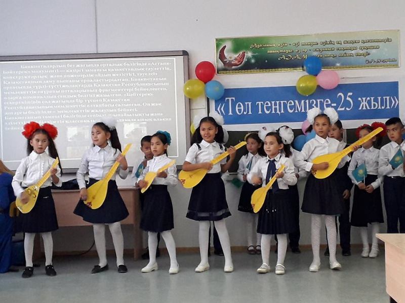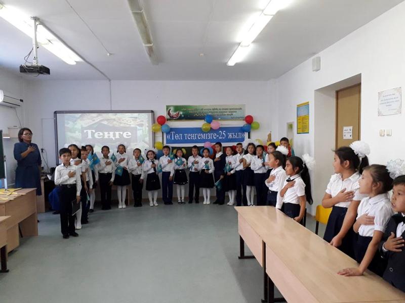 25 қазанда 4 "Ә" сыныбында "Төл теңгемізге-25 жыл" тақырыбында ашық тәрбие сағаты өткізілді. Сынып жетекшісі: Оразалова Урбигул. Ашық тәрбие сағатында тәуелсіз еліміздің айрықша белгісі теңгемен тереңірек таныстырып, Отансүйгіштік патриоттық сезімдерін оятатын "Атамекен", "Көк тудың желбірегені" т.б. әндермен, өлеңдер шырқалды. Тәрбие сағатқа 4 сынып оқушылары мен сынып жетекшілері және ДТЖО лар қатысты.