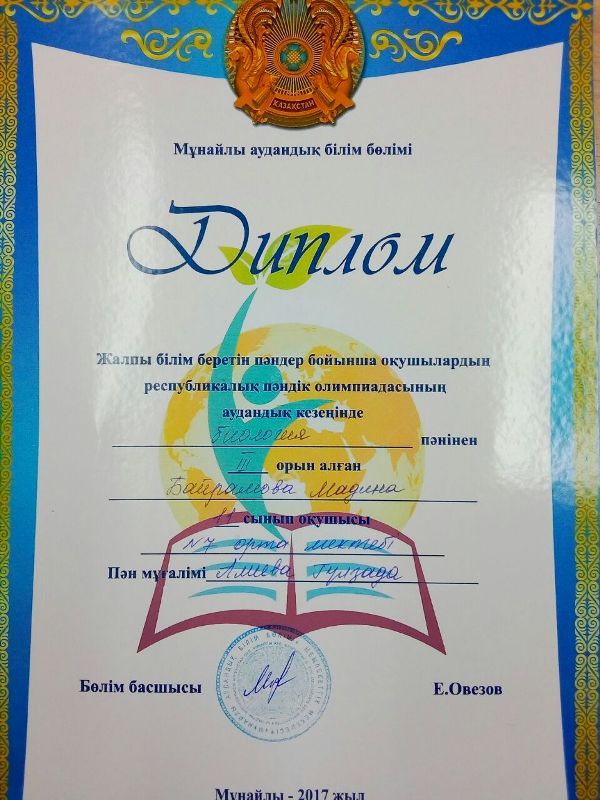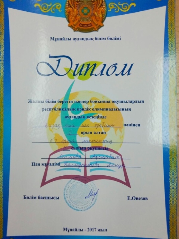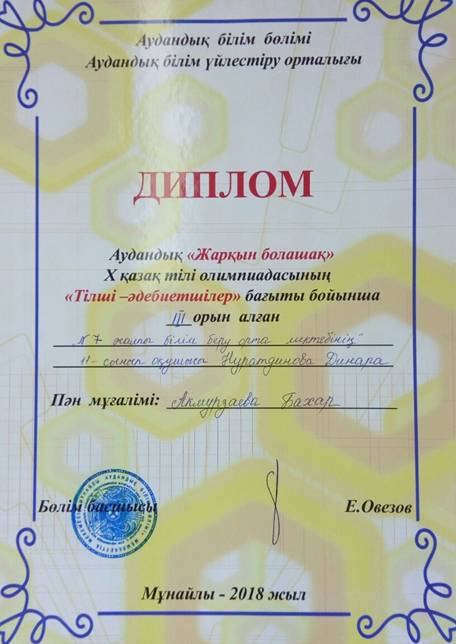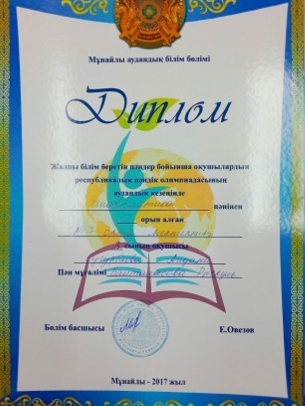 Аудандық 4 сынып оқушысыАйладер Нағимаарасында өткен олимпиадасынан ІІ орынға ие болған |