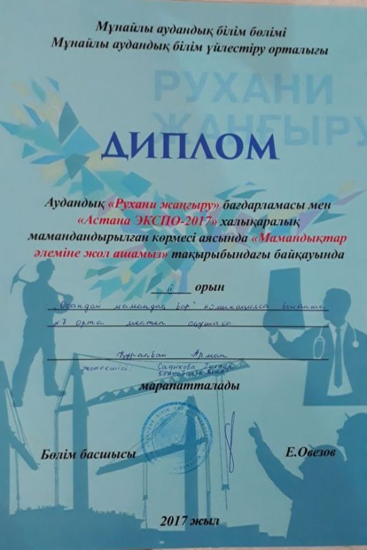 2017 жылы,Аудандық «Рухани жаңғыру» бағдарламасы мен «Астана ЭКСПО - 2017» халықаралық мамандандырылған көрмесі аясында «Мамандықтар әлеміне жол ашамыз» тақырыбындағы байқауында Құрақбаев Арман 11 «А» сыныбының оқушысы (презентация) ІІ орын дипломымен және 11 «Б» сыныбының оқушысы (эсседен) І орын дипломымен марапатталды.