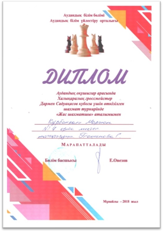 Аудандық оқушылар арасында Халықаралық кроссмейстер Дармен Садуақасов кубогы үшін өткізілген шахмат турнирінде Құрбанғали Маржан «Жас шахматшы» аталысымен марапатталды.