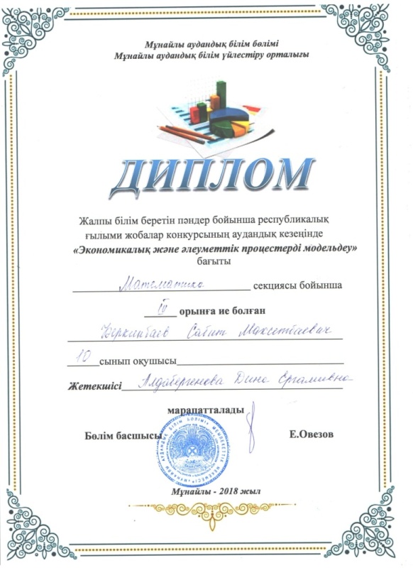 2018 ж, Мұнайлы аудандық жалпы білім беретін пәндер бойынша республикалық ғылыми жобалар конкурсының аудандық кезеңінде «Экономикалық және әлеуметтік процестері модельдеу» бағытының математика секциясы бойынша 10 сынып оқушысы Беркинбаев Сабит ІІІ орынмен марапатталды. Жетекшісі: Алдабергенова Дина
