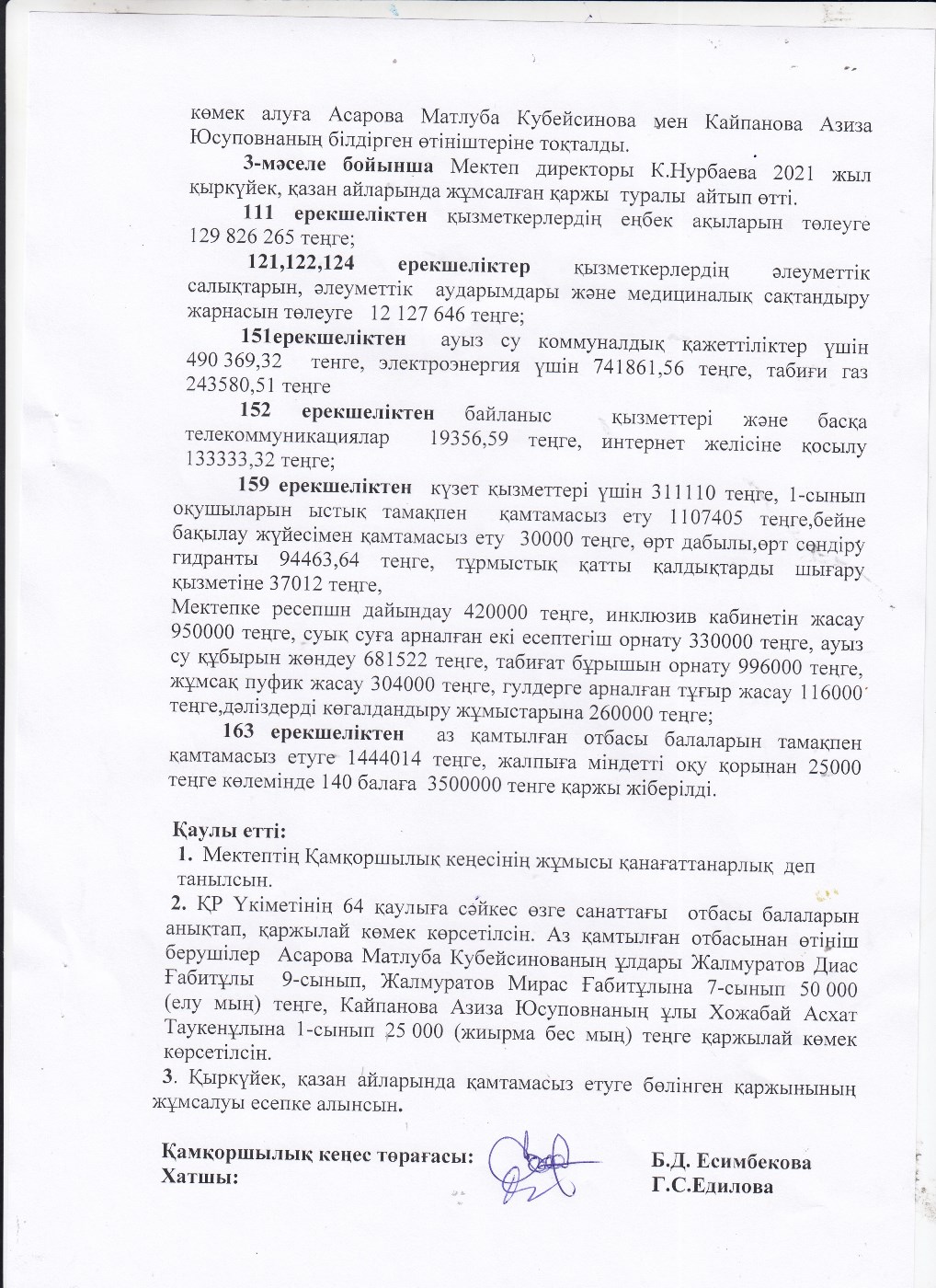 Әлеуметтік көмекті қажет ететін оқушылардың тізімі анықталып, жергілікті мемлекеттік мекемелерге бекітілді. Нәтижесінде Атамекен ауылдық әкімшілік тарапынан және жеке кәсіпкерлер тарапынан 211 оқушыға көмек көрсетілді. Көрсетілген көмектің түрі: Мектеп формалары, мектеп сөмкесі оқу құрал-жабдықтарымен.