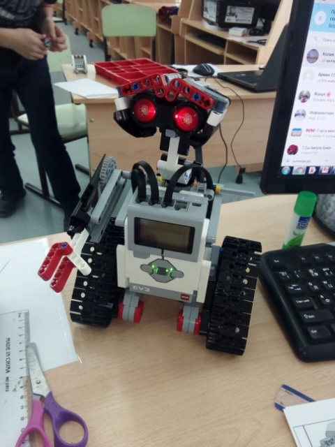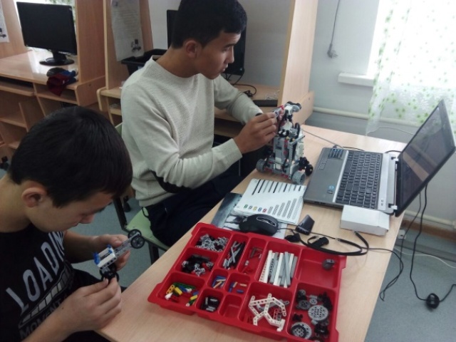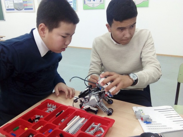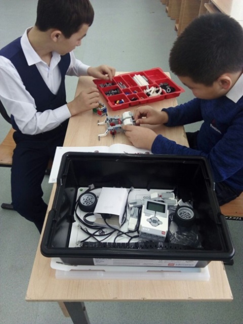 Робототехника сабағында 8 және 11 сынып оқушылары роботты құрастыруда. Пән мұғалімі: Садыкова Г.
