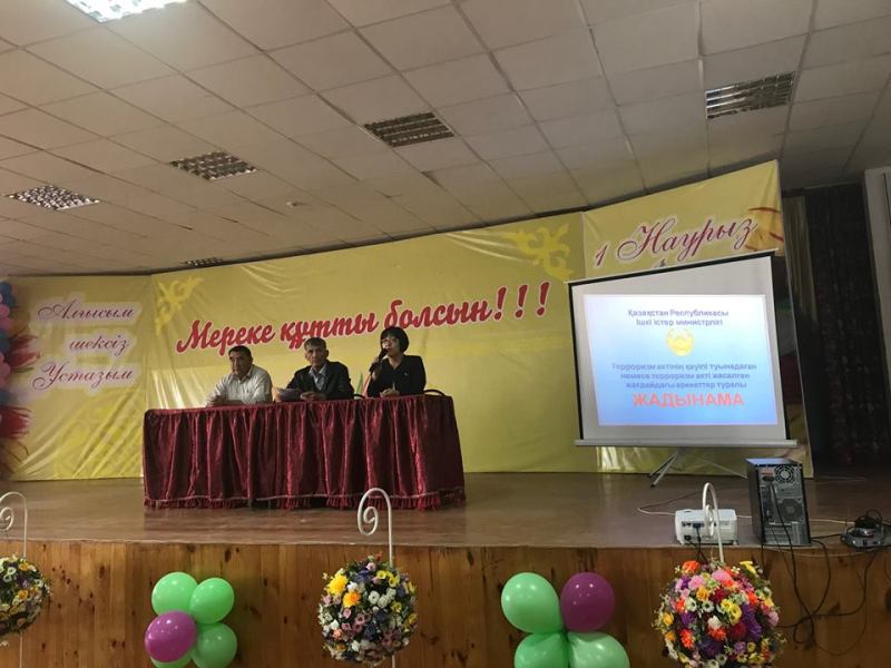 24 қазанда тәрбие ісі жөніндегі орынбасары Д.Танатарованың ұйымдастыруымен «Діни экстремизм мен терроризмге қарсы әрекеті» жөніндегі мемлекеттік бағдарламасы аясында дәстүрлі емес діни ағымдарға кіруді болдырмау мақсатында түсінік жұмысы жүргізілді. Жиналысқа мұғалімдер, кіші қызметкерлер, күзетшілер және де 5-11-сынып оқушылары қатысты.